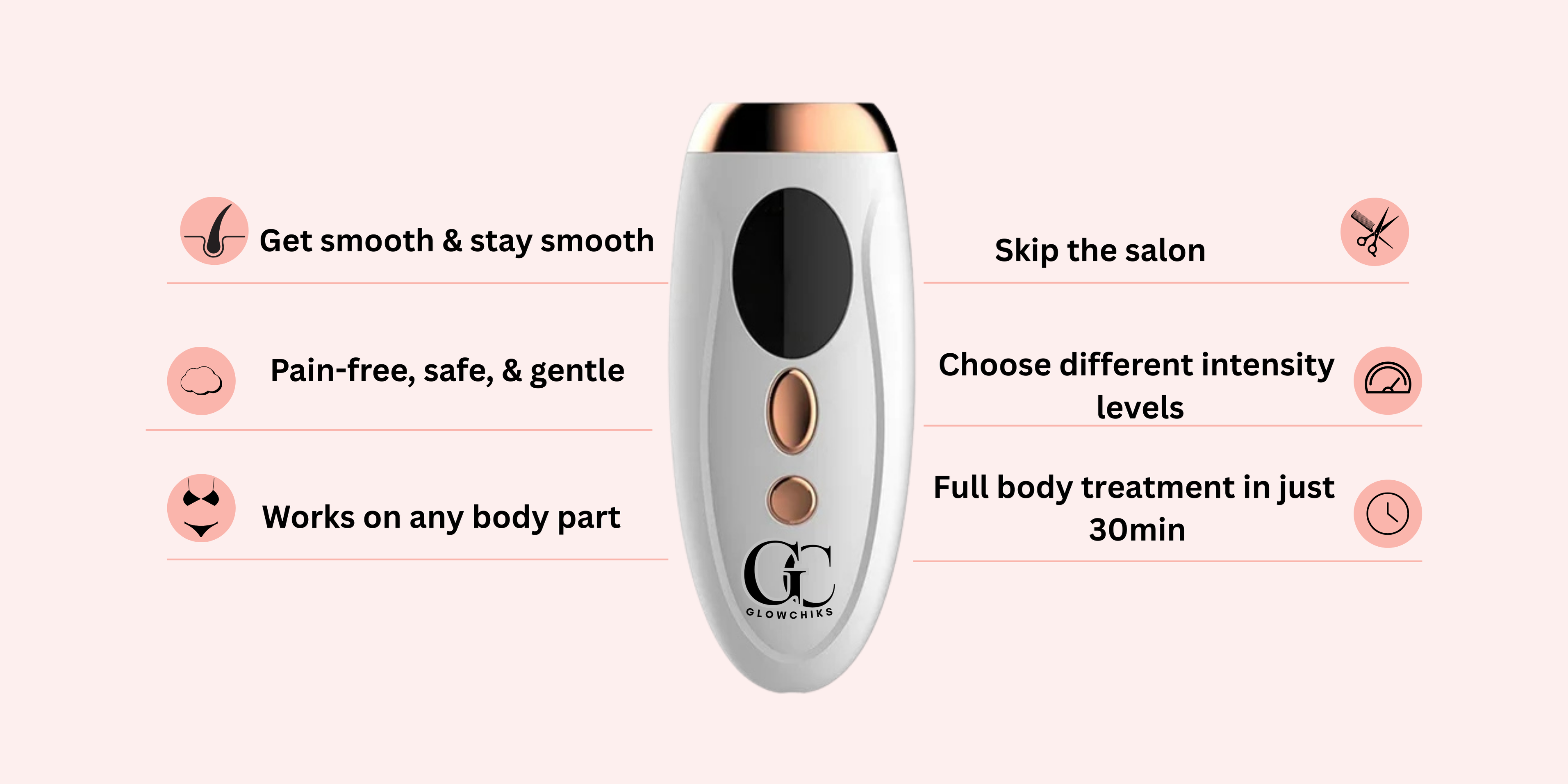 GlowChiks™ leads to permanent hair reduction, leaving you smooth and confident for the long run. If a few strands ever dare to return, your handset is always ready for a little touch of romance.