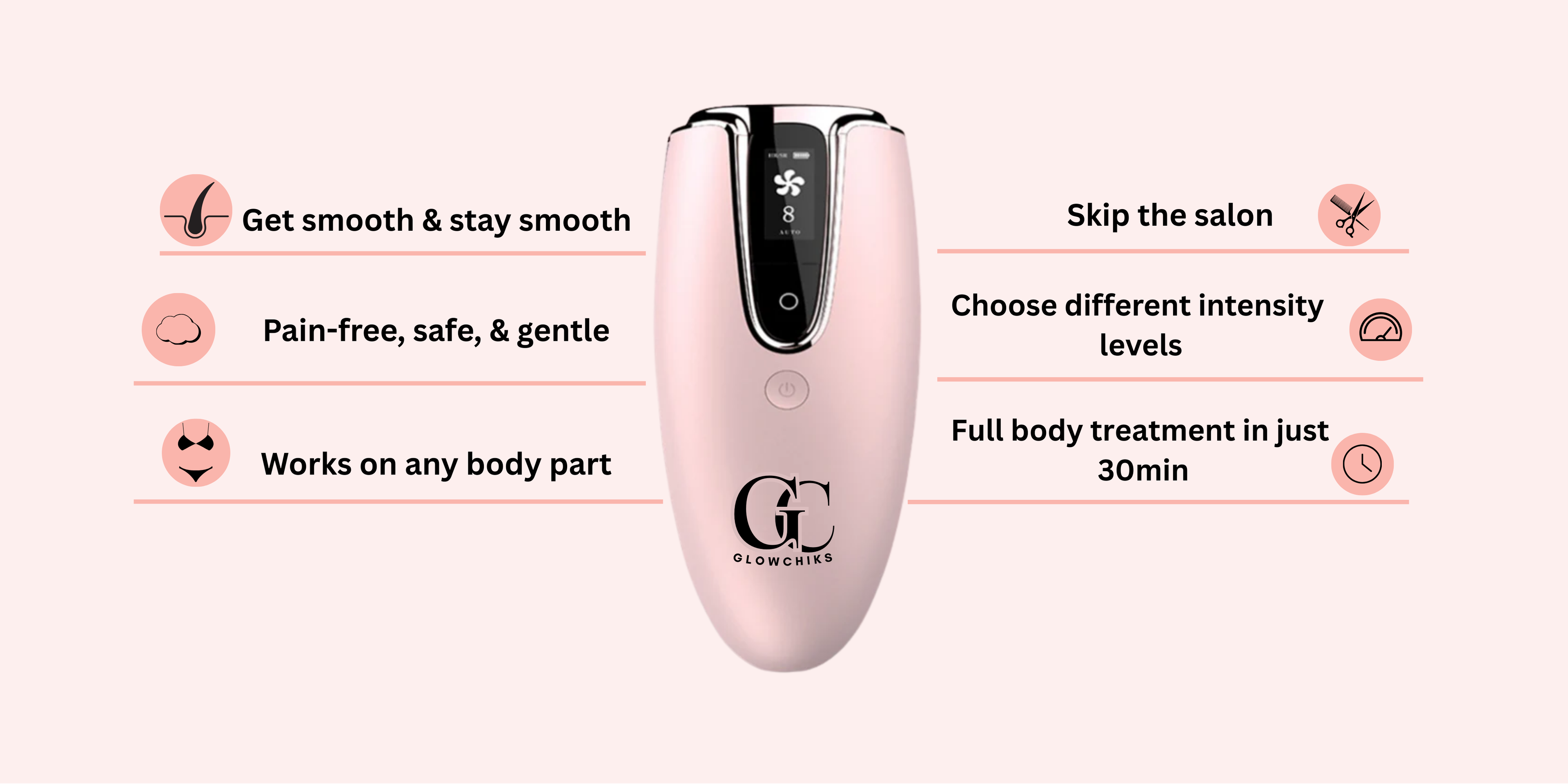 Gone are the days of nicks, razor burns, and wax-strip yelps. GlowChiks™ feels like a warm kiss on your skin – soft, delicate, and barely there. For those with sensitive skin, lower settings keep it oh-so-gentle.